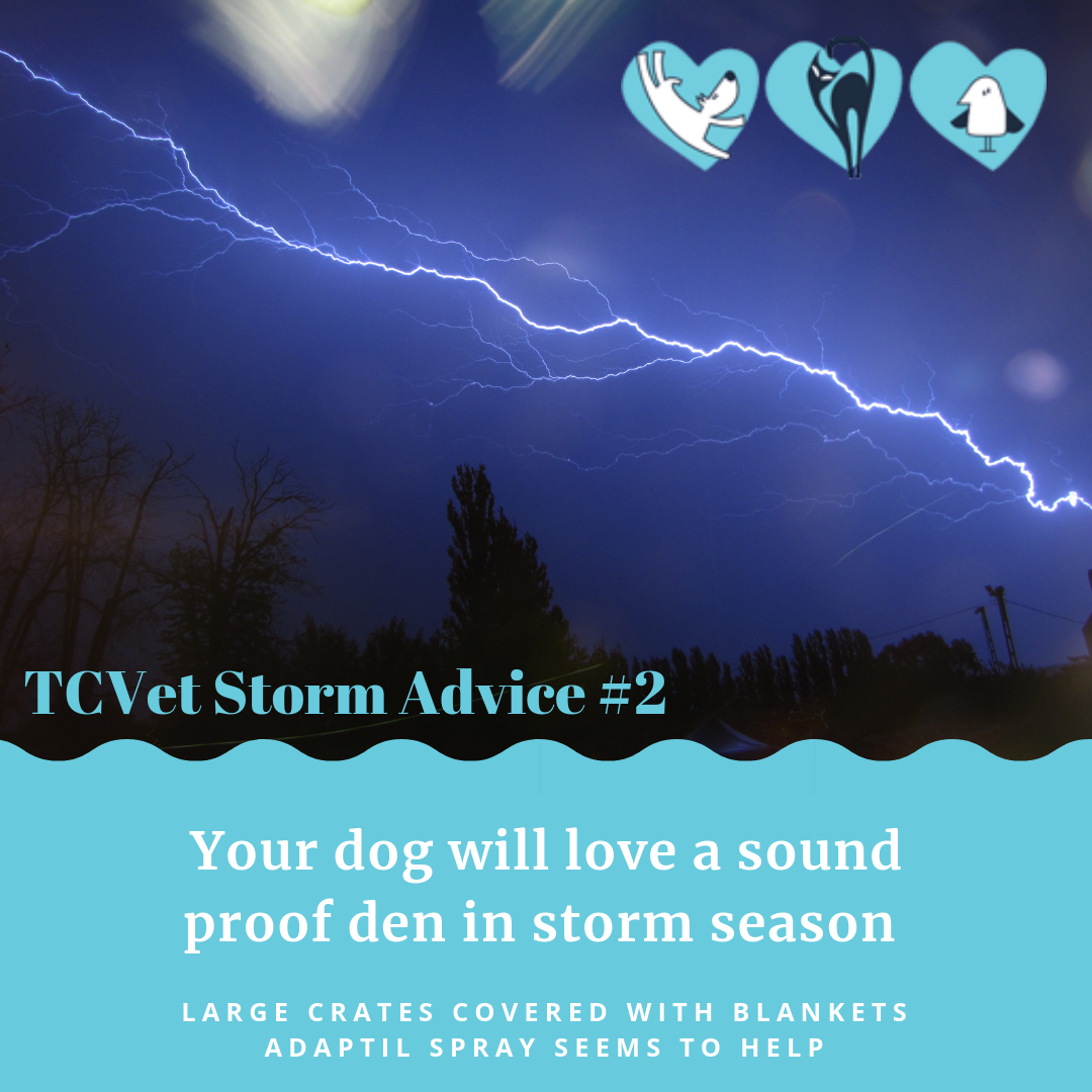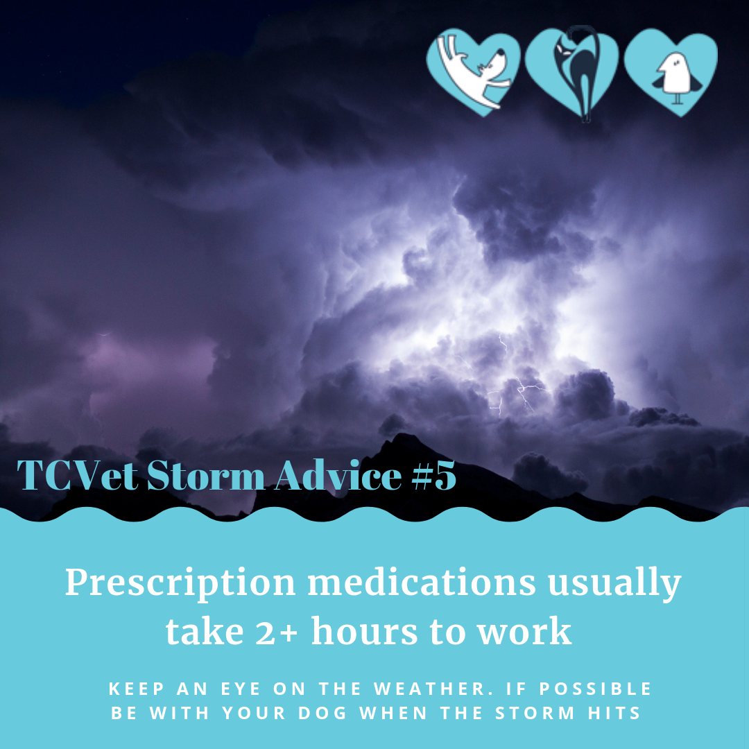 In severe cases there are prescription medications available for dogs with storm phobias. We don’t like to use these, but we understand sometimes we have to. TCVet would like to remind you that all medications have some risk, especially with repeated use. In the case of storm phobia medications, they can often take about 2 hours to work, so often unless you get in early they are not much help.