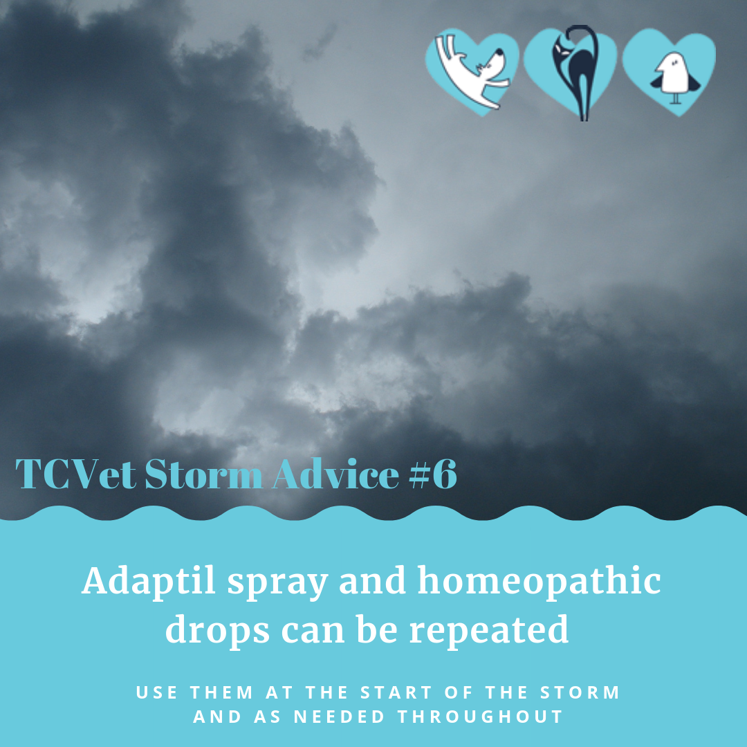When using storm drops and pheromones sprays for storms in your pet remember they will often need to be re-administered. Unlike with the prescription medications, this is actually a great idea during the storm, as it can act to keep your dog calm.